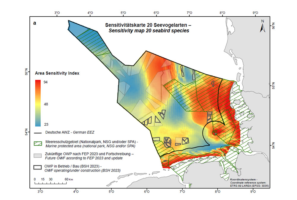 Sensitivitätskarte vor, die deutlich zeigt, welche Gebiete im Hinblick auf die Meidung von OWP durch Seevögel