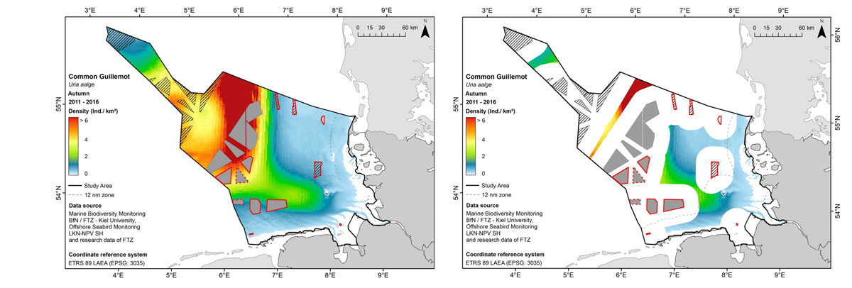 Links: Verbreitung der Trottellummen in der deutschen Nordsee im Herbst. Darüberliegende graue Gebiete